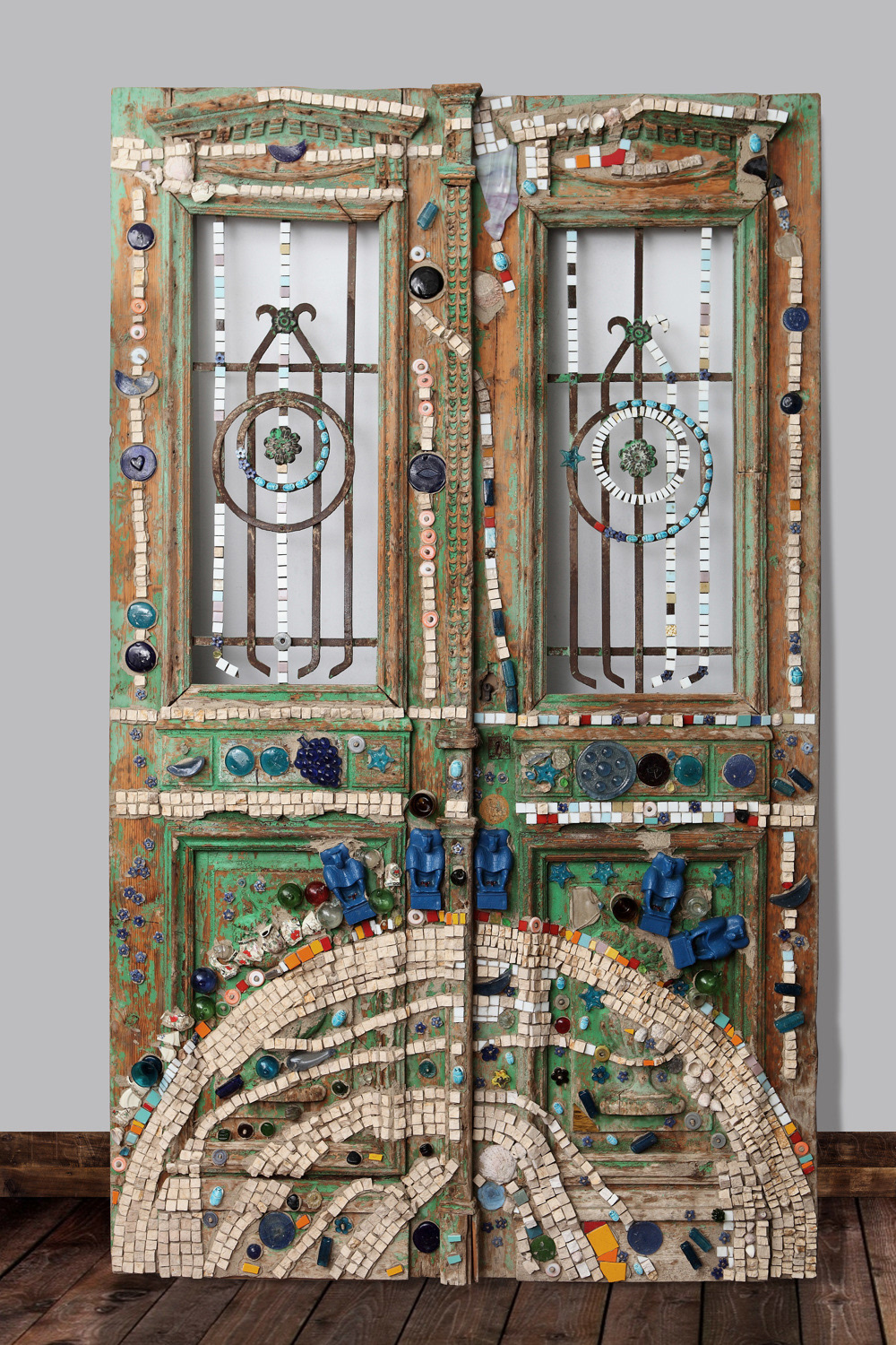 This project included a 100 years old door, which I restored . I was careful to keep its character as old Egyptian doors that carry their own memory and experience, thus, I didn't cover the entirety of the door with tesserae in order to keep its identity. as for the tesserae themselves, I used the ancient Egyptian symbols of the baboon and scarab which were intended to reflect the long experience and cultural history of the doors, I also used natural collected materials such as pieces of marble, stones and ceramics, etc. which carry their own experiences too. the reverse sides of the doors were painted in oil colours with primitive representations symbolizing a Horse.